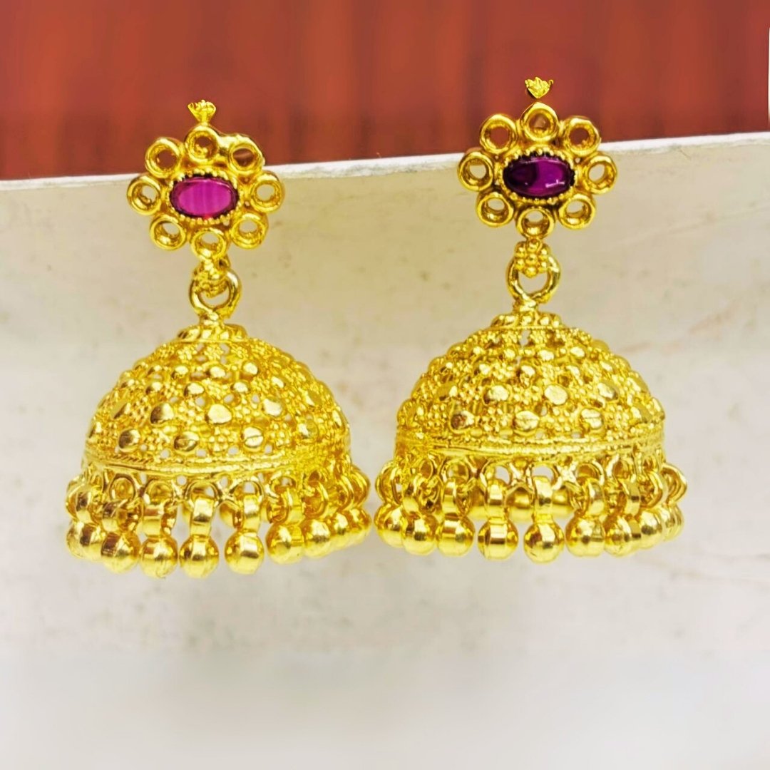 - DESIGN: Traditional temple-style jhumka earrings featuring intricate floral patterns and purple stone-studded tops with ornate gold-plated dome shapes