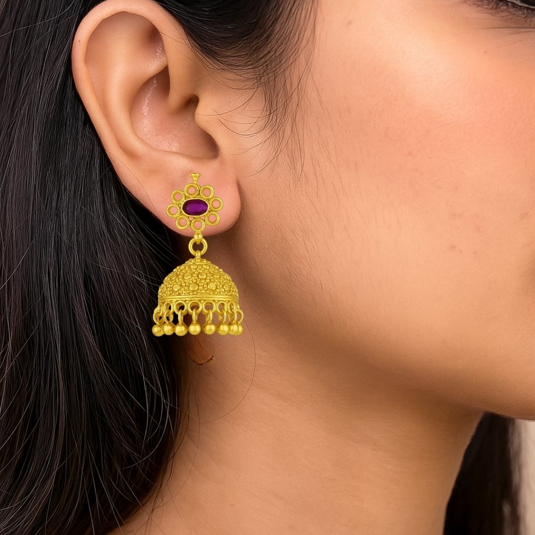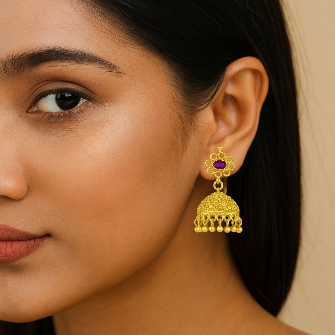 Elevate your traditional ensemble with these exquisite jhumka earrings, masterfully crafted in 925 sterling silver with luxurious gold plating. These statement pieces feature an intricate floral design at the top, adorned with striking purple stone centrepieces. The dome-shaped pendant showcases detailed temple-style craftsmanship with a textured surface pattern and decorative small spherical drops along the bottom edge that create a mesmerising jingling effect when worn. Perfect for festivals, weddings, and special occasions, these jhumkas combine classical Indian artistry with contemporary elegance. The sophisticated design incorporates traditional motifs while maintaining a lightweight, comfortable wear. These versatile earrings complement both traditional attire and modern fusion wear, making them an essential addition to your jewellery collection. Each jhumka is meticulously detailed with fine craftsmanship that highlights the rich heritage of Indian temple jewellery.