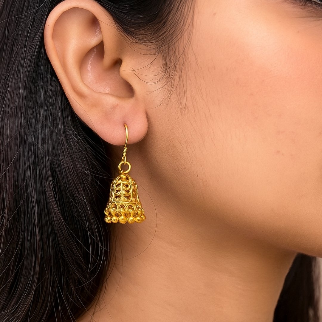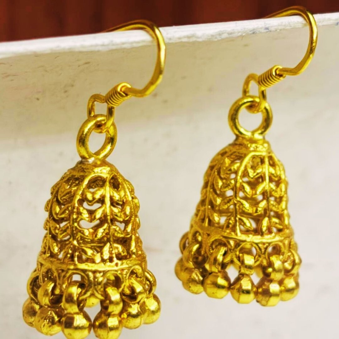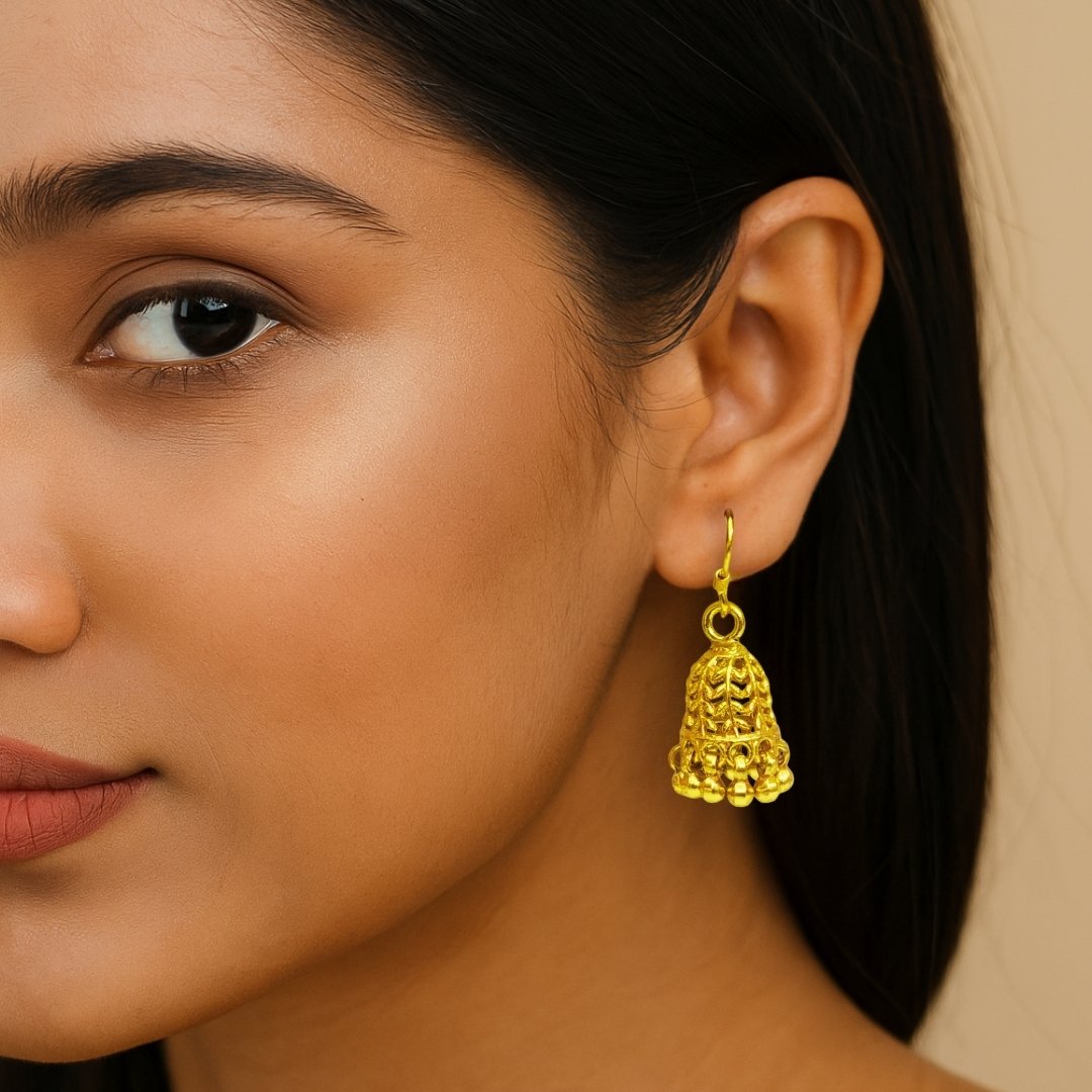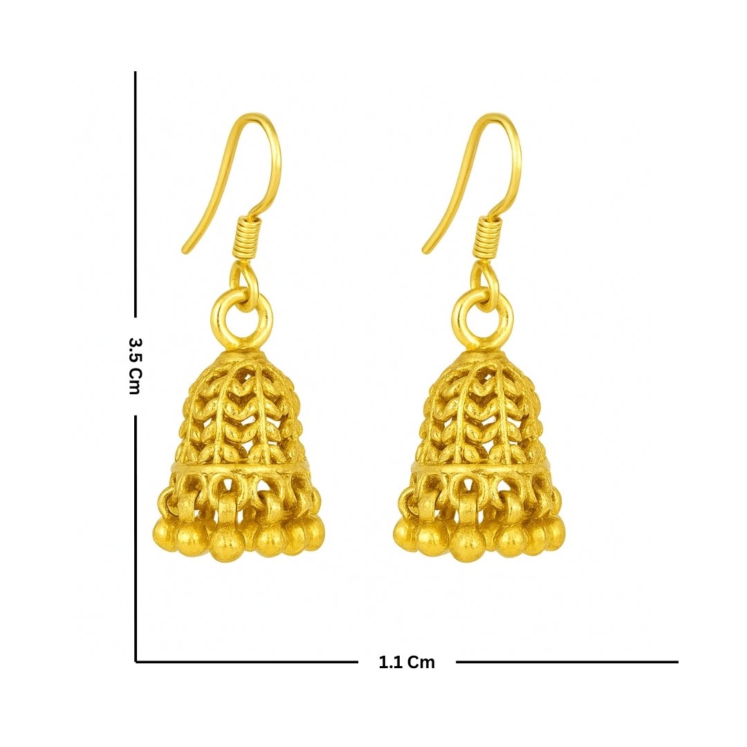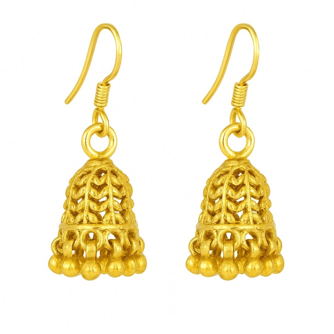 Elevate your traditional ensemble with these exquisite golden jhumka earrings. Featuring an intricate bell-shaped design with delicate filigree work, these earrings showcase masterful craftsmanship. The dome-shaped upper portion displays beautiful leaf motifs, while the lower edge is adorned with small golden beads that create a charming movement effect. The earrings come with secure fish-hook closures for comfortable wear. These versatile pieces complement both everyday wear and festive attire, making them a must-have addition to your jewellery collection. The lightweight construction ensures comfort during extended wear, while the classic design makes them perfect for various occasions, from family gatherings to formal events. Their timeless appeal makes them an excellent choice for those who appreciate traditional Indian jewellery with a contemporary touch.