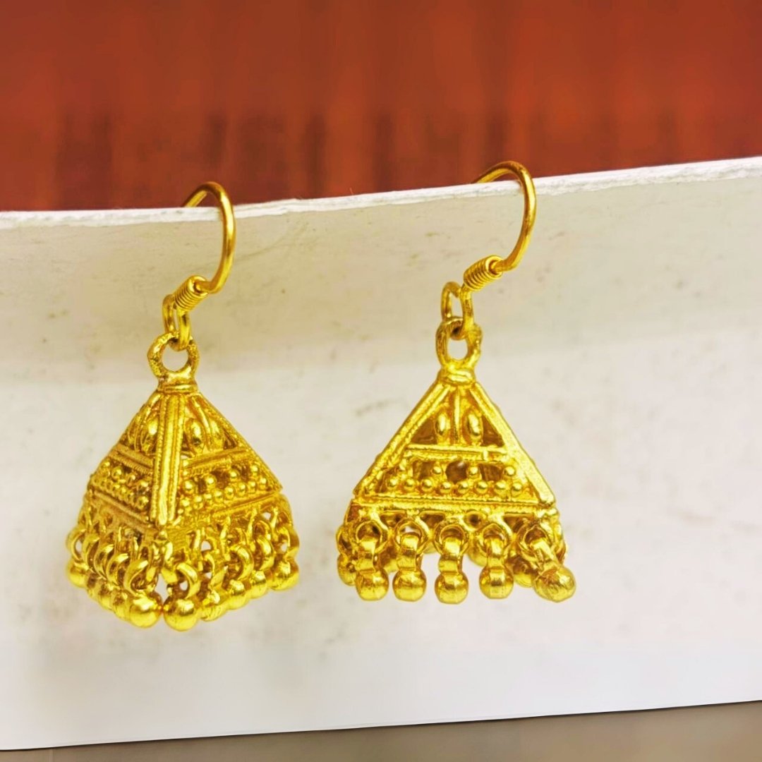 Elevate your ethnic style with the Har G 925 Sterling Silver Gold-Plated Triangular Jhumka Earrings, a masterpiece of traditional Indian craftsmanship. Made from pure 92.5% sterling silver, these jhumkas feature a unique triangle-shaped dome design with ornate detailing and charming ghunghroo drops.